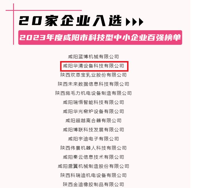• 2024-02-20熱烈祝賀咸陽華清設備科技有限公司榮獲2023年度咸陽市科技型中小企業(yè)榜單